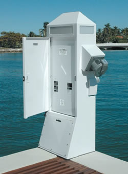 The electrical power pedestal has evolved over the years into more than just shore power for boats. The power pedestal is rapidly becoming a “utility pedestal,” which includes metered power, TV, telephone, Internet, water hose bibs, sometimes with water meters, and other utility hook-ups like in-slip sewer pumpout service.